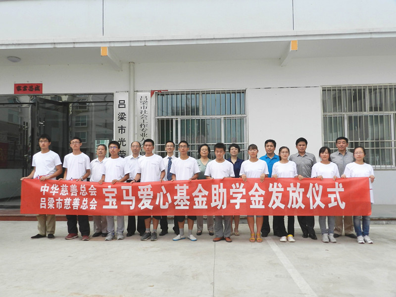 8月20日上午,吕梁市慈善总会“宝马爱心基金”助学金发放仪式在吕梁市光荣院二楼会议室举行。市慈善总会会长解金亭、副会长兼秘书长刘学良、副会长范引禄、副会长高民、吕梁顺宝行汽车销售服务有限公司总经理周冬梅以及受助学生代表参加会议。宝马(中国)汽车贸易有限公司从2012年开始对岚县、石楼考上大学的10名贫困学子予以资助。今年,经市慈善总会向中华慈善总会争取,宝马爱心助学基金项目办又为岚县、方山、石楼3县下达20名资助名额。在吕梁顺宝行汽车销售有限公司、市教育局、三县高中的积极配合支持下,受助遴选工作进展顺利,20名学子获得了捐助资金。吕梁顺宝行汽车销售服务有限公司自2011年5月成立以来已成功举办3次爱心基金助学活动,累计出资52万元,对36名贫困学子进行了资助。