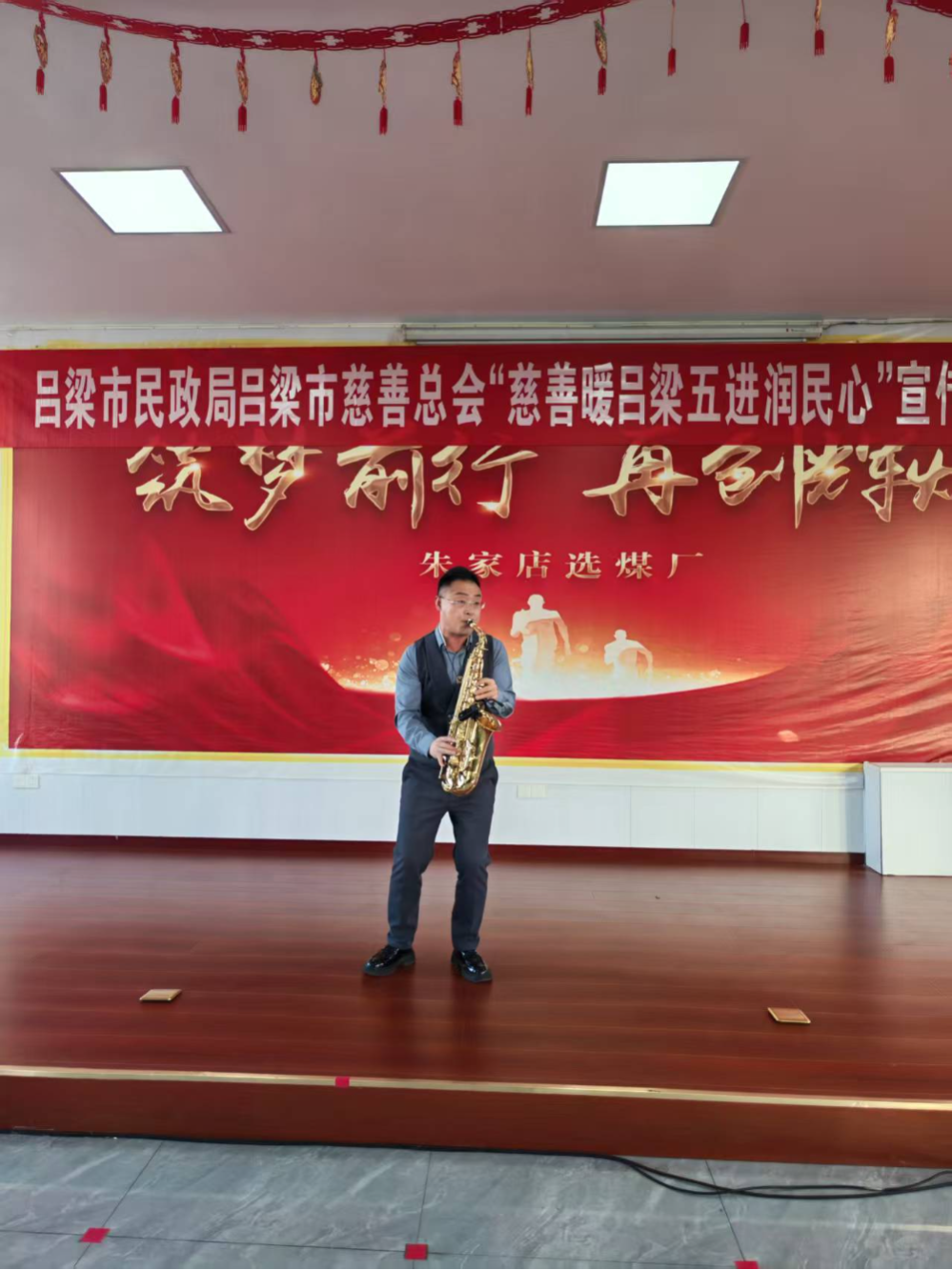 而在朱家店煤矿,薪传火文化传媒则带来了唢呐与萨克斯的精彩对话,以中西合璧的时尚方式,奏响了激情澎湃的慈善乐章,赢得了现场工友们的阵阵掌声。